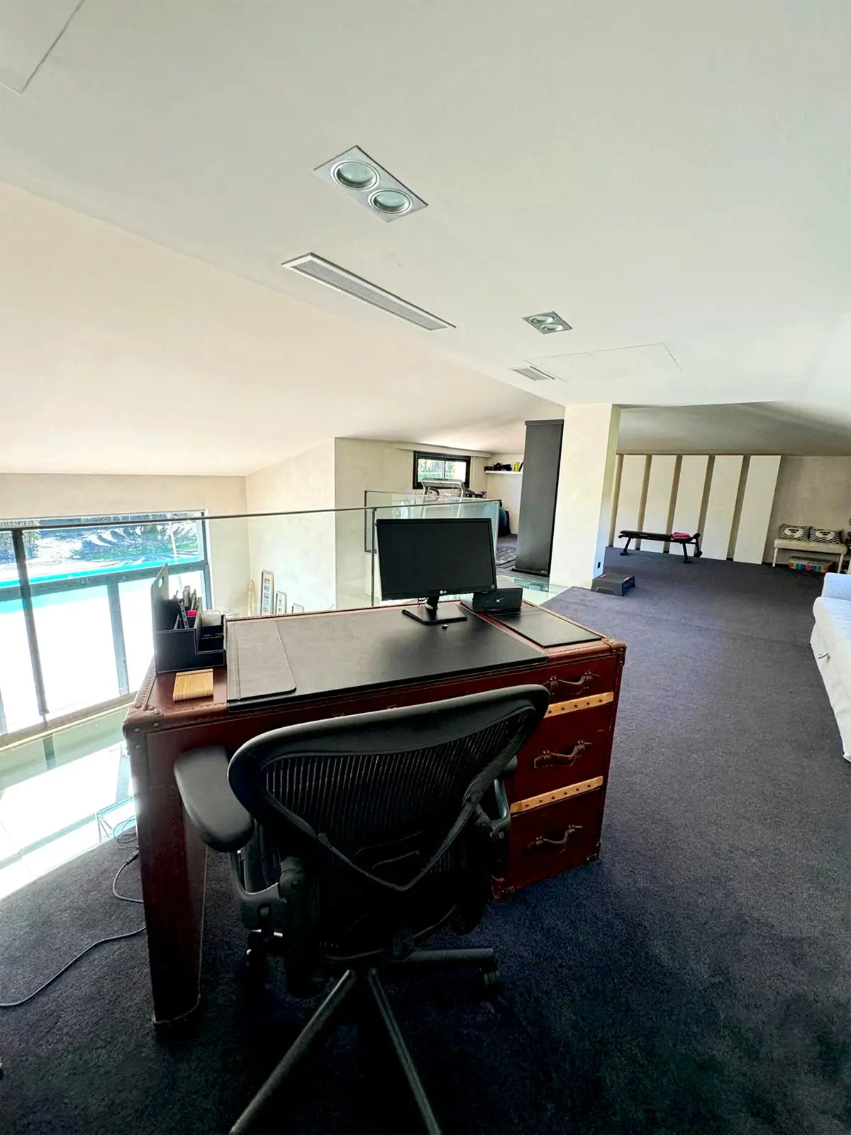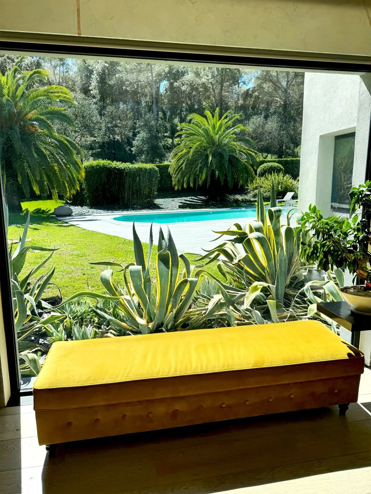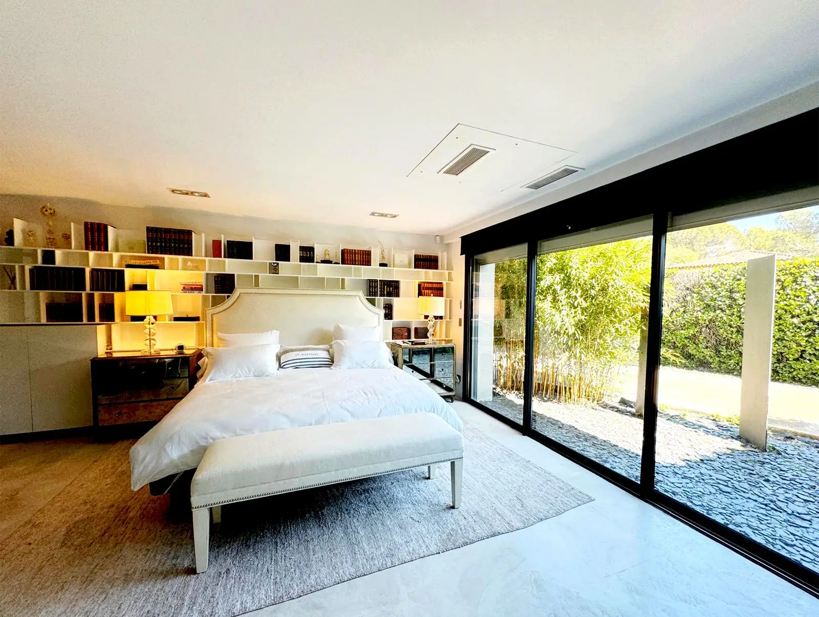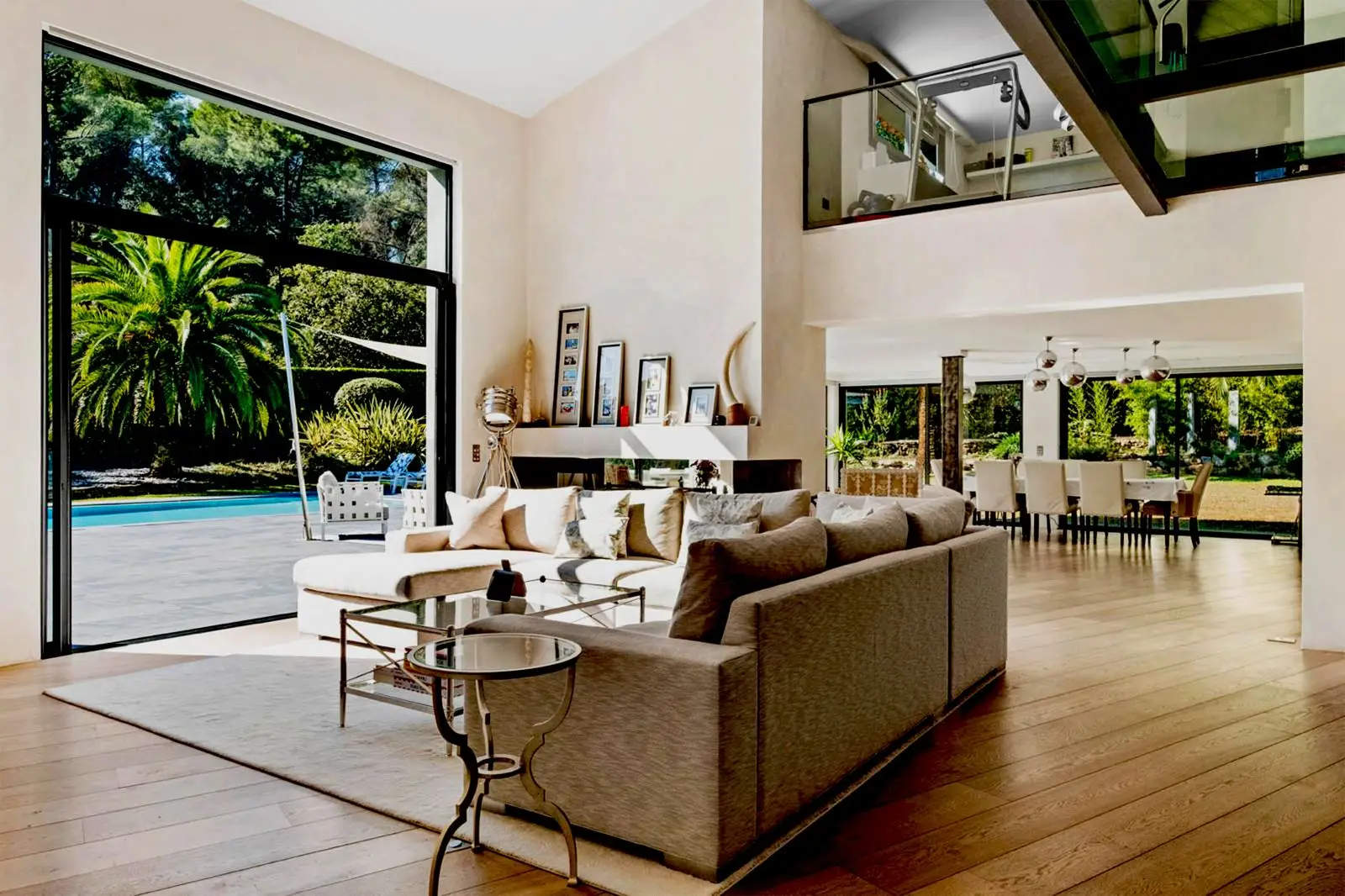 In the sought-after private estate Les Parcs de Mougins, just minutes from Mougins School, the Cannes-Mougins golf course, and the highway access, this villa offers a vast reception area with a double-sided fireplace that naturally extends outdoors. The kitchen (by Bulthaup), with its central island, faces the dining room. Still on one level, there are two en-suite bedrooms, including a master suite with a full bathroom and walk-in closet. A mezzanine—used as an office, library, and gym—overlooks the living room.