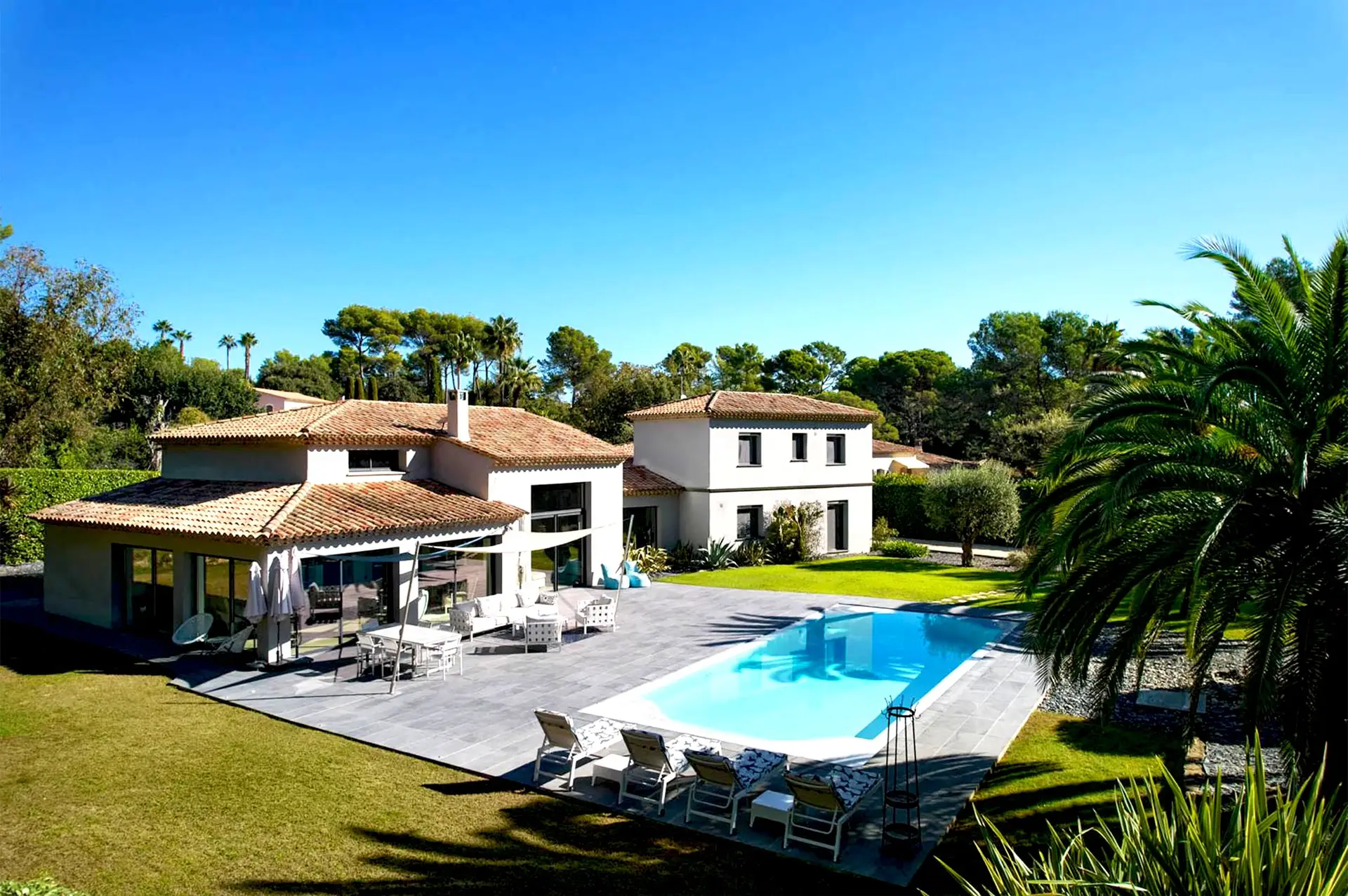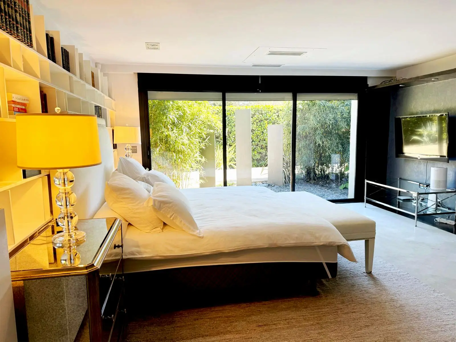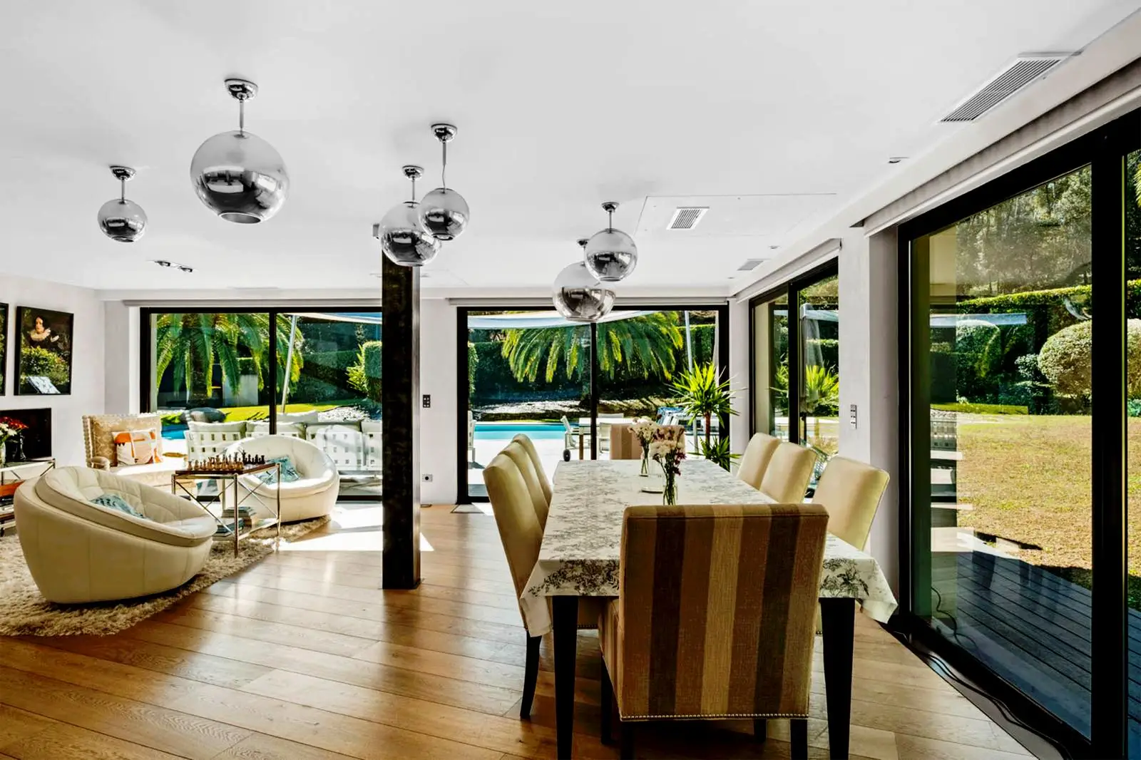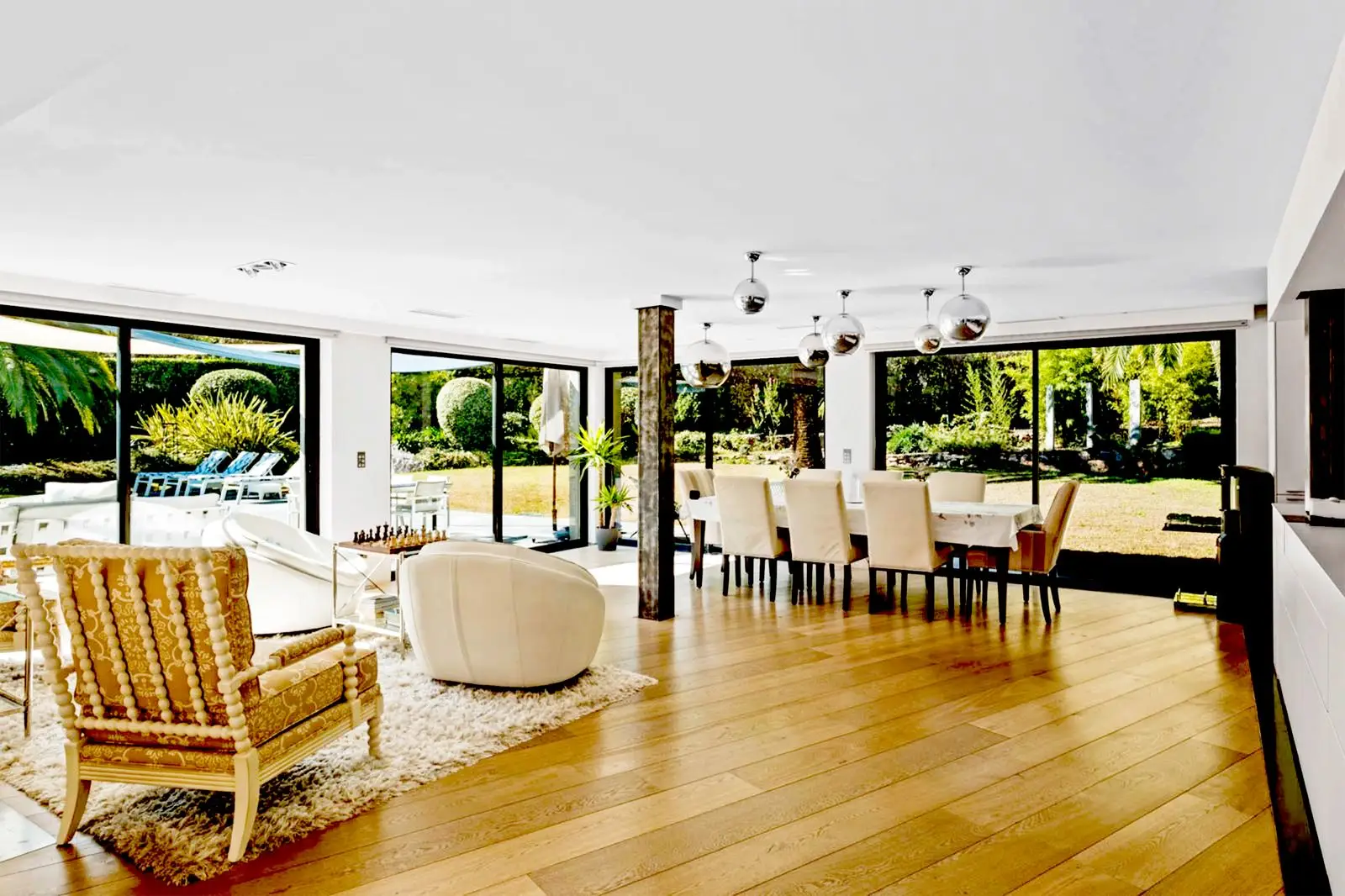 In the sought-after private estate Les Parcs de Mougins, just minutes from Mougins School, the Cannes-Mougins golf course, and the highway access, this villa offers a vast reception area with a double-sided fireplace that naturally extends outdoors. The kitchen (by Bulthaup), with its central island, faces the dining room. Still on one level, there are two en-suite bedrooms, including a master suite with a full bathroom and walk-in closet. A mezzanine—used as an office, library, and gym—overlooks the living room.
