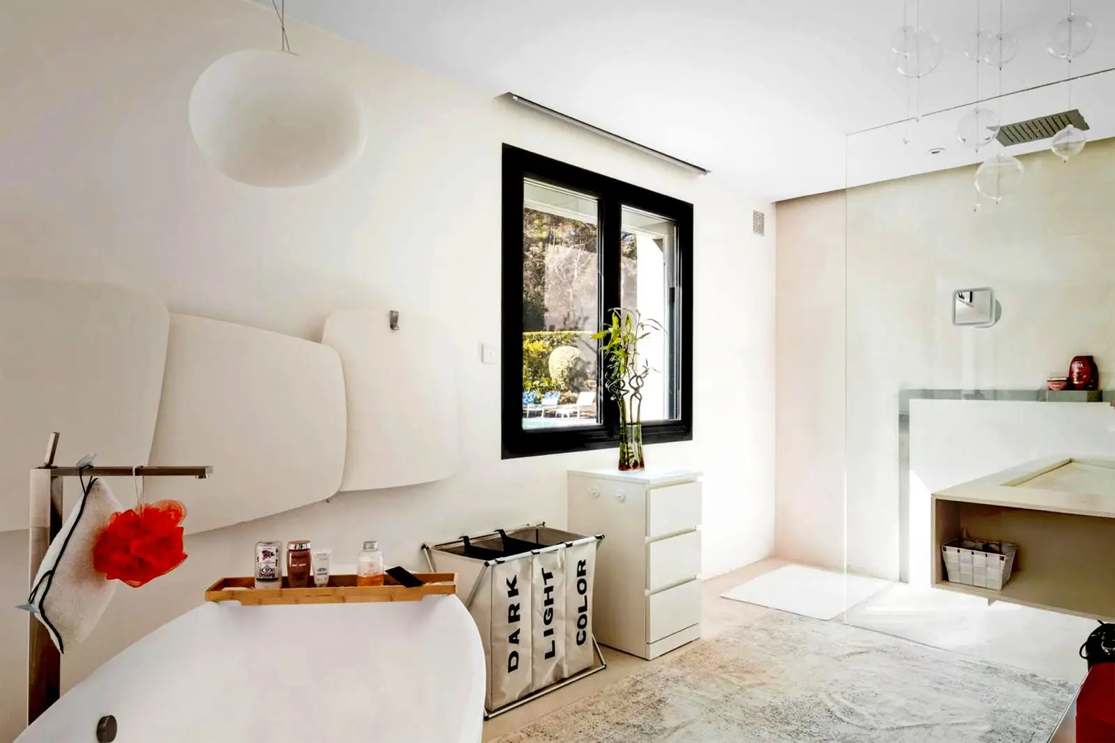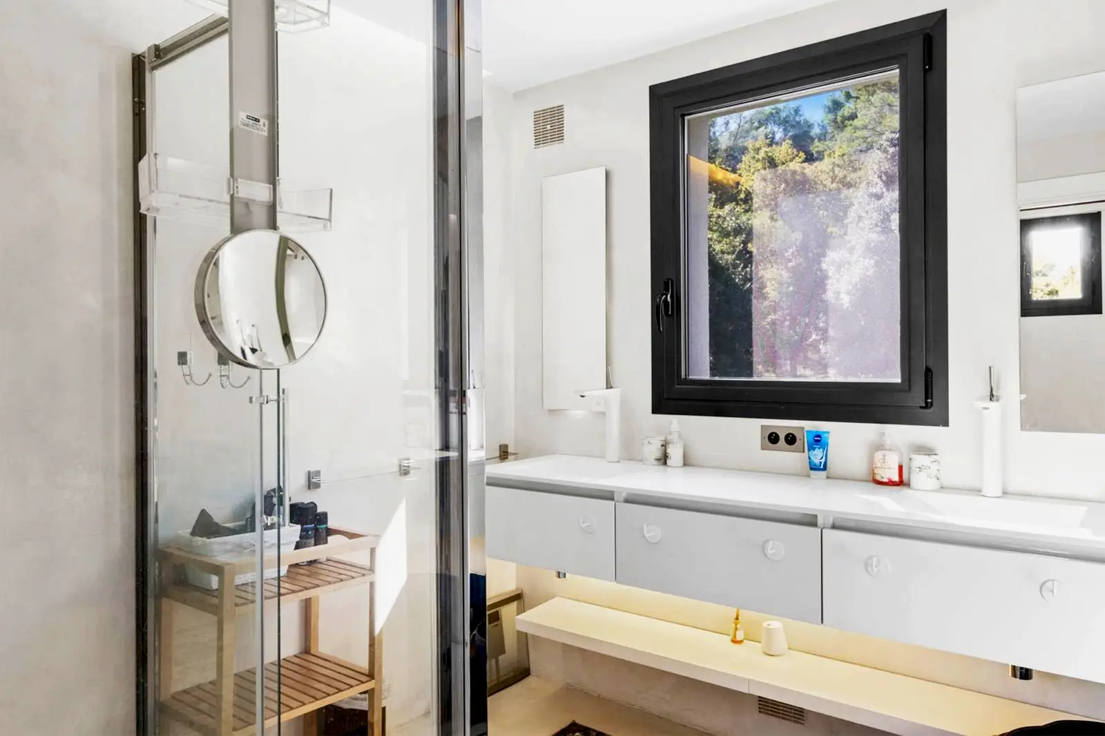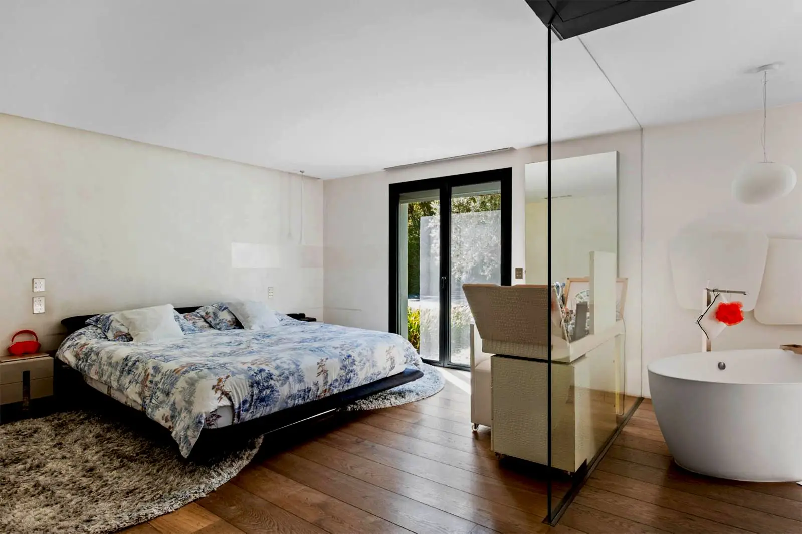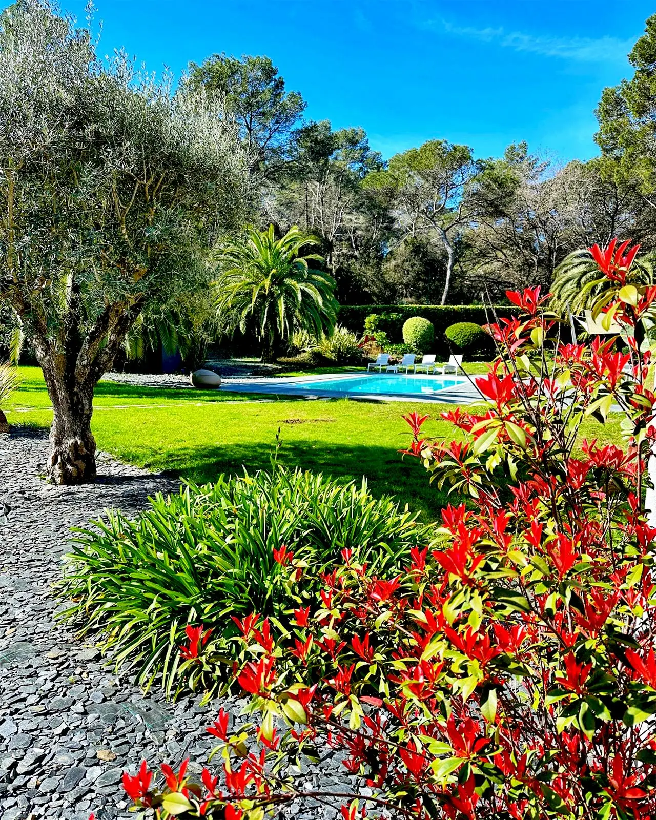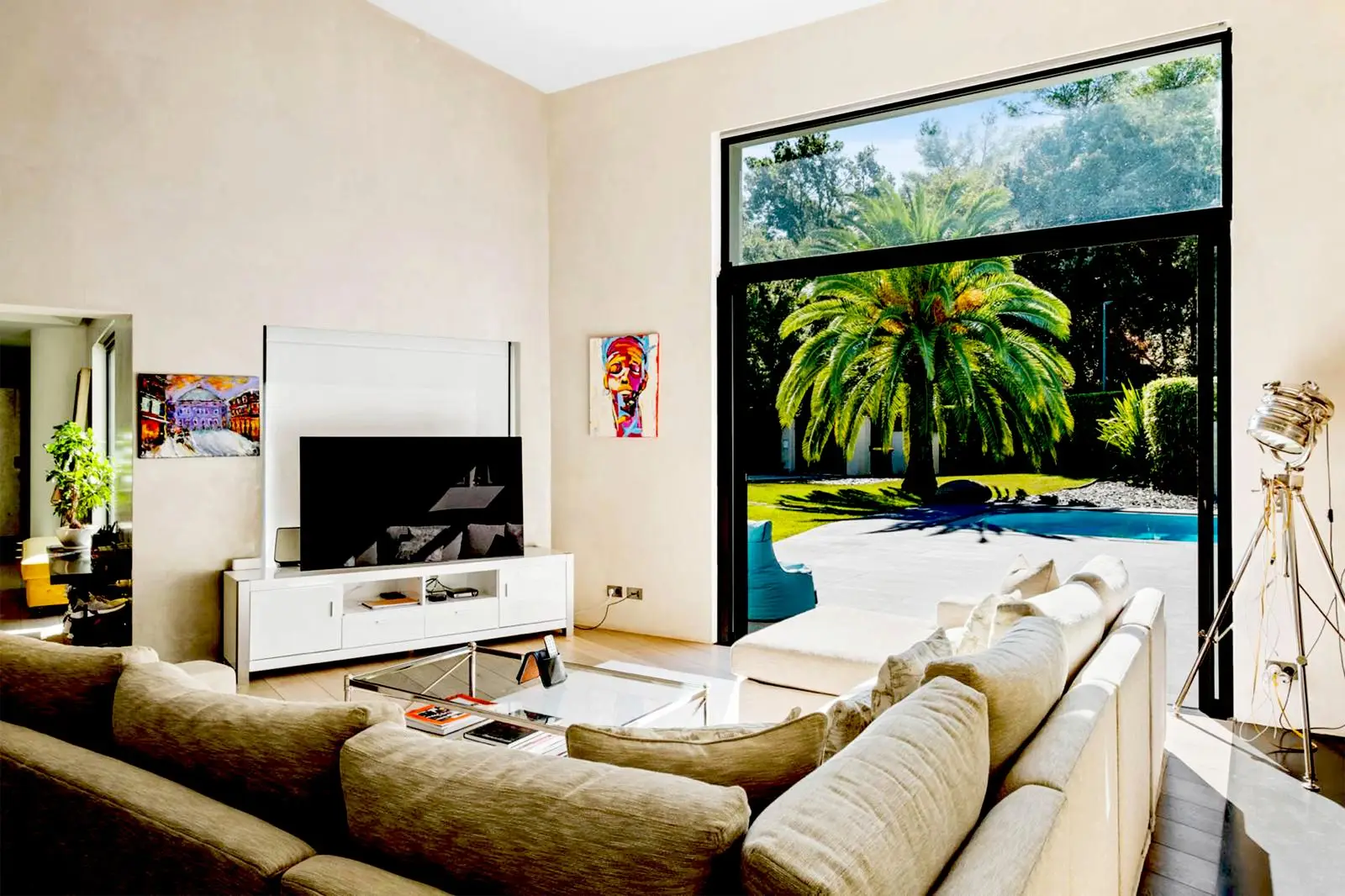 In the sought-after private estate Les Parcs de Mougins, just minutes from Mougins School, the Cannes-Mougins golf course, and the highway access, this villa offers a vast reception area with a double-sided fireplace that naturally extends outdoors. The kitchen (by Bulthaup), with its central island, faces the dining room. Still on one level, there are two en-suite bedrooms, including a master suite with a full bathroom and walk-in closet. A mezzanine—used as an office, library, and gym—overlooks the living room.